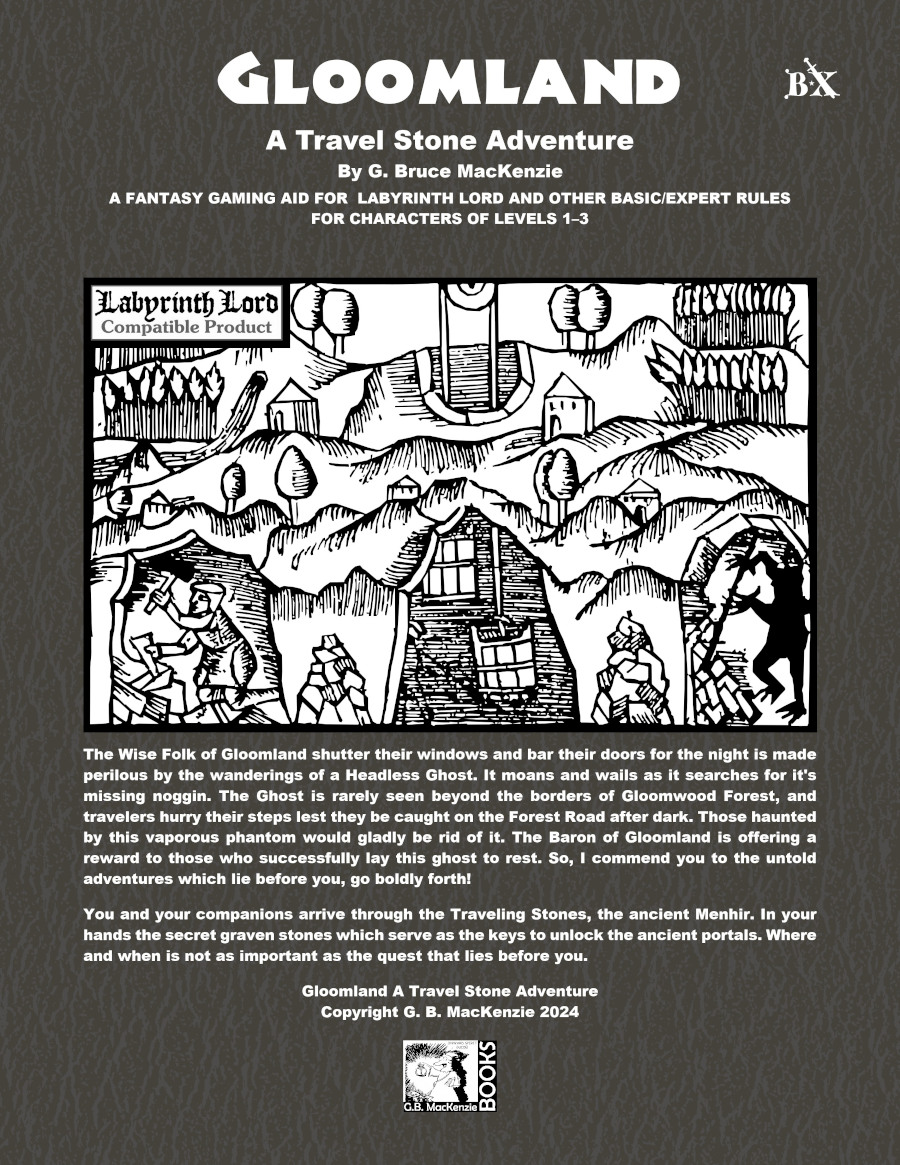 I have included various ready-to-play characters and blank character sheet. These were prepared specifically for Labyrinth Lord but are generally applicable to most B/X games, Burly Barleycorn, Gruff Stonebeard, Hamfist Strongthorn, Heyou Halt, Magus Astra, Rowan Treefriend, and Tertius Lumina. A Gloomland Travel Stone blank character sheet, designed by yours truly, contains what I consider important and relevant, including notably encumbrance which is worked out for each one. I like to start out the characters at 3rd level but without XP so the players still have to earn their way from First to Fourth Level and beyond. The character sheet is compatible with BX-ish games like OSE and Labyrinth Lord. . If any other localization of rules apply one may annotate or copy the statistics as appropriate to another character sheet.
